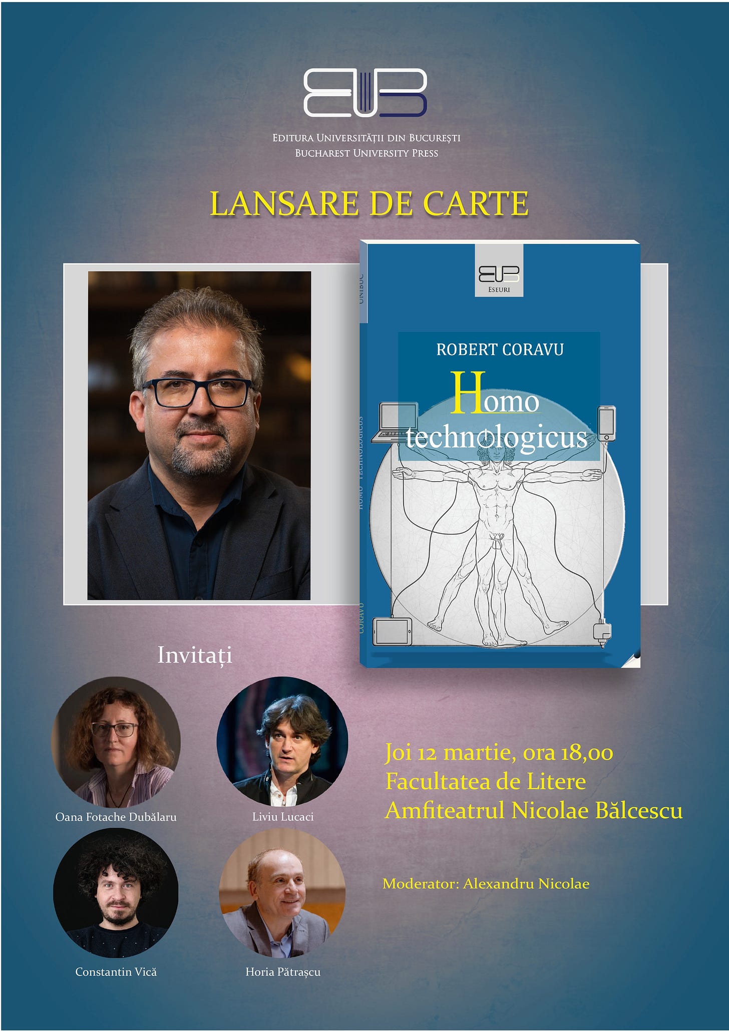 Mâine, 12 martie 2026, de la ora 18:00, în Amfiteatrul Nicolae Bălcescu al Facultății de Litere, Universitatea din București, va avea loc lansarea cărții Homo technologicus de Robert Coravu.