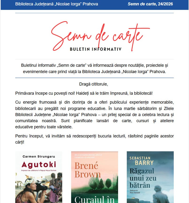 Biblioteca Județeană „N. Iorga” Prahova editează un newsletter intitulat Semn de carte (redactor: Loredana Stanciu) în care sunt semnalate „noutățile, proiectele și evenimentele care prind viață” în această instituție. Numărul 24 (2026) al publicației, care este distribuită lunar prin e-mail, a ajuns recent la cei peste 300 de abonați (R.C.)