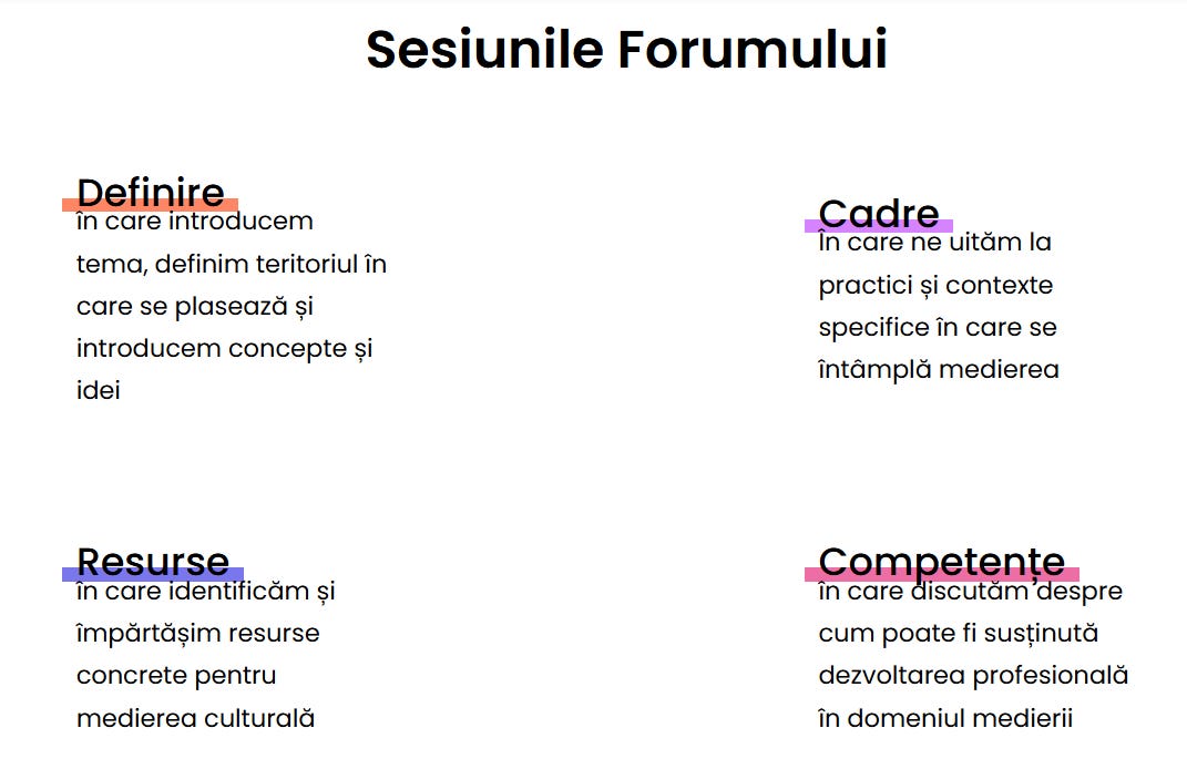 Evenimentul, care se adresează mediatorilor culturali, muzeografilor și pedagogilor muzeali, educatorilor culturali, cadrelor didactice, pedagogilor și educatorilor, artiștilor, scriitorilor, managerilor culturali, studenților din domeniile literatură, arte, comunicare și, nu în ultimul rând, bibliotecarilor, se va desfășura în patru sesiuni: Definire, Cadre, Resurse și Competențe.